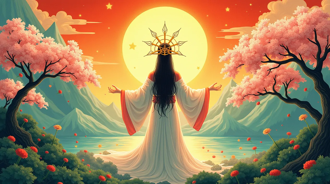 Sinta a luz vibrante da deusa Amaterasu, que personifica o sol e guia a linhagem imperial japonesa, iluminando não só o céu, mas também as artes e rituais sagrados.