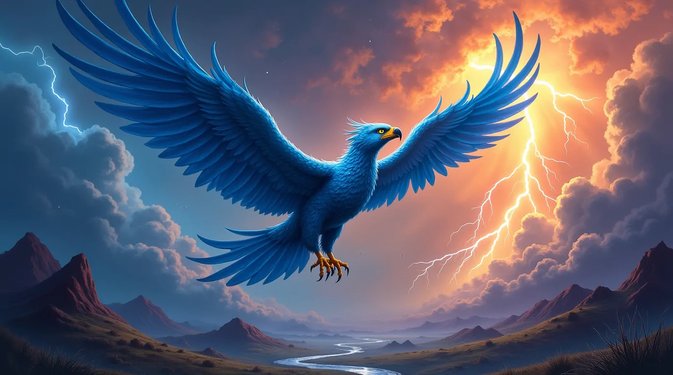 O Thunderbird é a personificação mitológica do trovão azul, sendo uma criatura celestial cuja plumagem e presença evocam o tom azul do céu durante tempestades. Ele atua como agente do relâmpago e do som estrondoso, simbolizando poder, proteção e renovação na espiritualidade indígena.