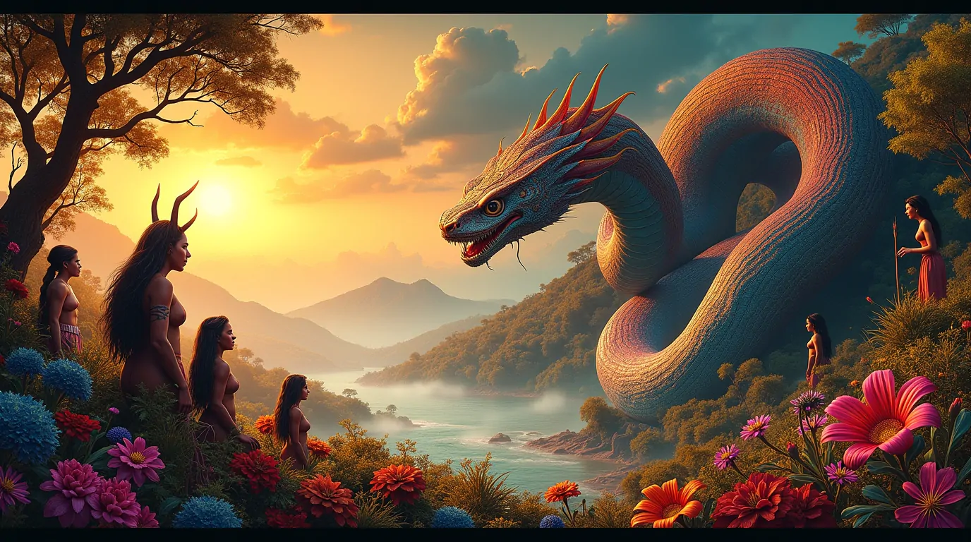 A serpente arco-íris é a poderosa entidade criadora responsável pela formação de rios, vales e pela entrega da fertilidade. Associada à água e às chuvas, ela é central em rituais e tradições que garantem a harmonia entre o homem e a natureza.
