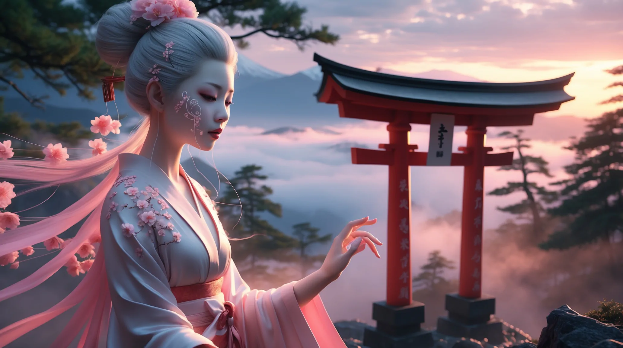 A princesa Konohanasakuya é a deusa da montanha, das flores de cerejeira e da vida efêmera. Seu nome significa “flor que floresce”, e ela simboliza a beleza, a delicadeza e a brevidade da existência humana. Sua lenda, onde seu esposo Ninigi rejeita a deusa da longevidade (Iwanaga), explica por que os humanos têm vida curta, mas bela como as sakuras. Ela é também protetora do Monte Fuji contra erupções, mostrando a coexistência entre a fragilidade e a força da natureza.