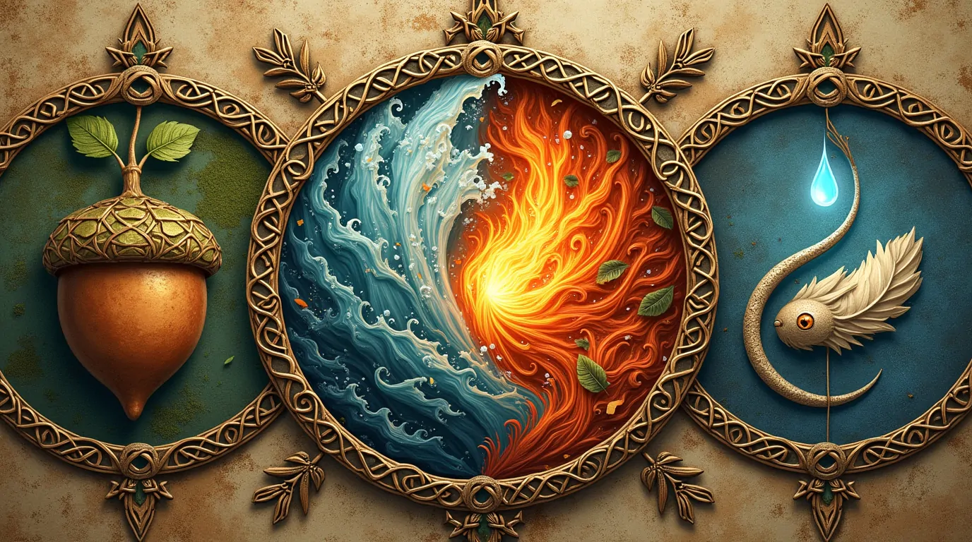 Considere a forma como os elementos se complementam na natureza: a Terra proporciona a base para a vida, mas precisa da Água para nutrir, do Fogo (do sol) para aquecer e amadurecer, e do Ar para respirar e espalhar as sementes. Na mitologia celta, essa dança entre os elementos se refletia nos ciclos da vida, na fertilidade da terra e na própria existência dos deuses. “Certa vez, um druida sábio ensinou que ‘a força do fogo reside na madeira da terra, a fluidez da água molda a pedra, e o ar leva a chama para além do que os olhos podem ver. Cada um precisa do outro para existir plenamente’, demonstrando a profunda verdade da interdependência. Essa compreensão era fundamental para a vida cotidiana e espiritual dos celtas.