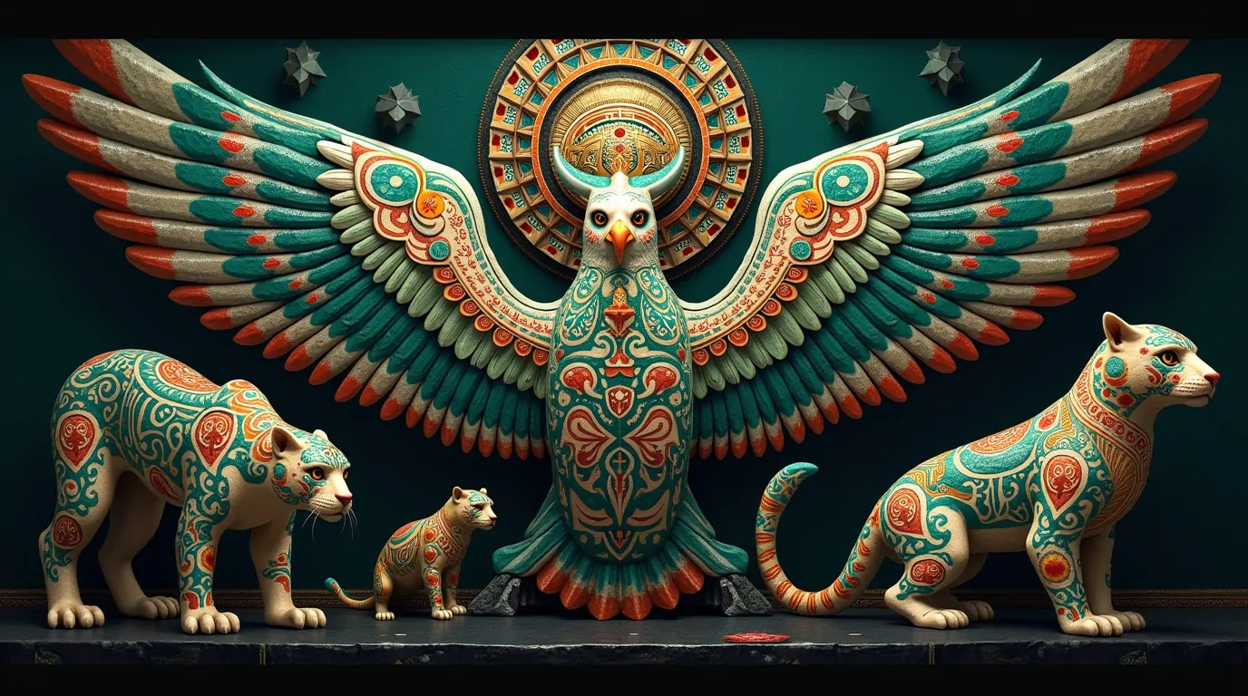 Aves como o quetzal representam liberdade e conexão com o divino. Esses animais eram muito mais que figuras; eram guias espirituais, protetores e, acima de tudo, forças vivas da natureza.